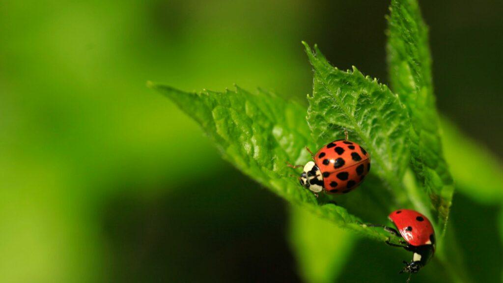 Insectos que consumen plagas. Las mariquitas son un ejemplo de depredador natural que se alimenta de pulgones, que son comunes en muchas plantas.