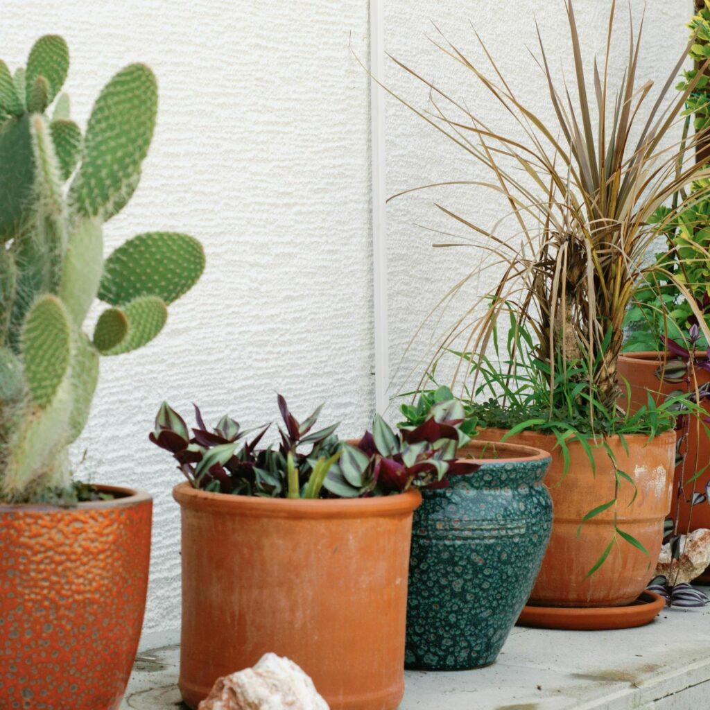 Crea grupos de 3 macetas de diferentes alturas en un mismo color o gama para lograr sensación de orden.